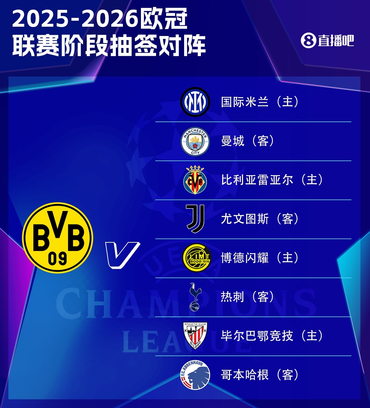 8月30日讯 欧足联公布了欧冠联赛阶段的详细赛程,每支球队将分别进行4场主场和4场客场比赛,以下为多特蒙德具体赛程(北京时间):